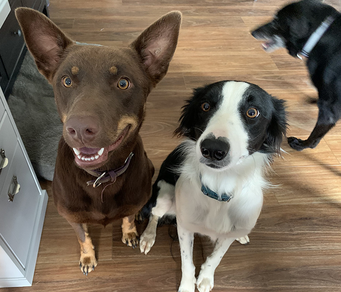 Kiba and Mochi the English staffy cross kelpies are very well behaved when they visit the office.
